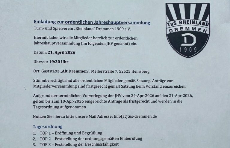 Am 21.04. findet in der Gaststätte Alt Dremmen die Jahreshauptversammlung statt.